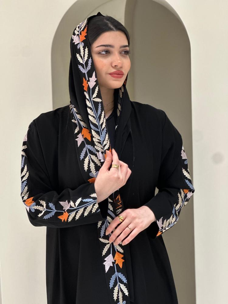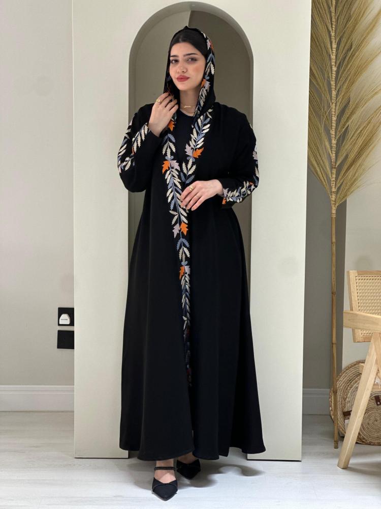 عبايه نص كلوش القماش كريب الرياض وتطريز ع العبايه قدام معا الكم